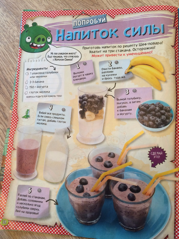 Кстати мы очень любим готовить по фото рецептам, и Эльвирке удобно брать их из журналов. Например, недавно мы готовили напиток силы от шеф-повара ANGRY BIRDS - журнал этот не совсем для девочек, но мы его периодически покупаем т.к. там есть смешные истории, задания ,поделки.