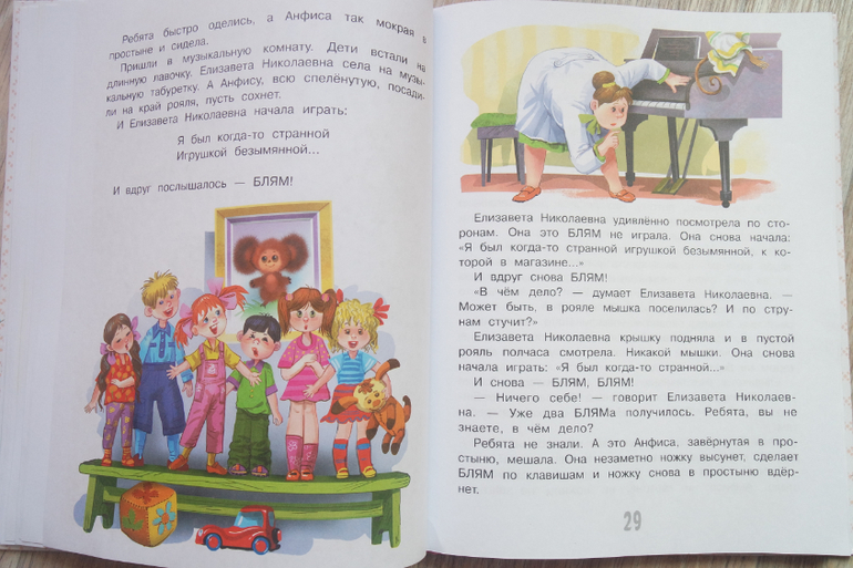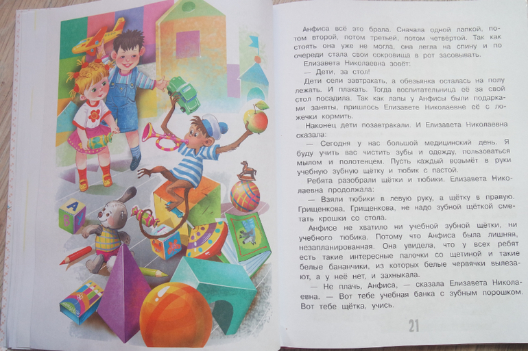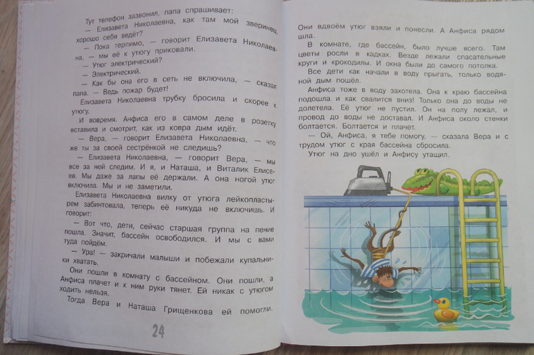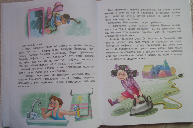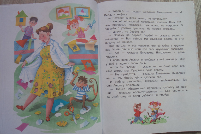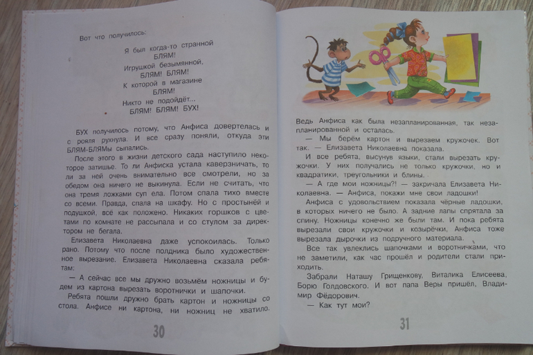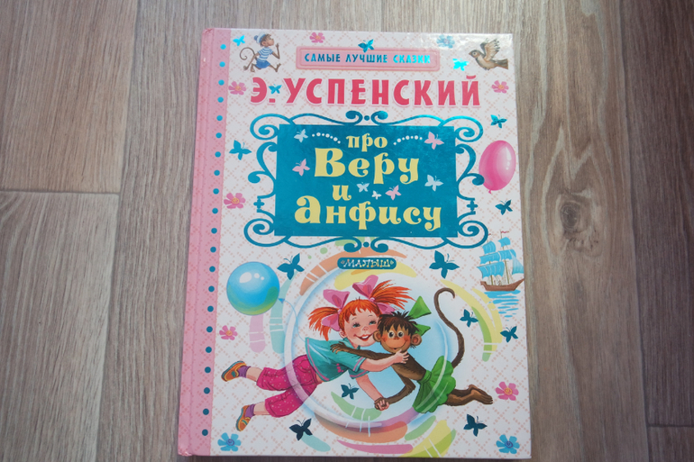 Спасибо дорогие ББешечки за помощь в выборе произведений. Я думала , что "Вера и Анфиса"для детей старше 5 лет.... Очень рада, что купила для четырехлетней дочки- ей очень-очень понравилось!!!! Вчера курьер доставил книги, пока старшие дети были в детском саду. Пролистав книгу, я подумала, что многовато текста, длинные рассказы... Забирая девочек из детского сада, я рассказала о новой книге про девочку Веру и смешную обезьянку. Всю дорогу мы строили догадки о чем книга и придумывали забавные истории про обезьянку. Из шести новых книг, дочка сразу узнала книгу про девочку и обезьяну.... Приступив к чтению, мы обнаружили, что мама Веры работает школьным учителем, так же как и мама моей дочки) Воспитательницу в детском саду зовут Елизавета Николаевна- моя старшая дочь воскликнула :"Как я!!". Объяснила, что ее зовут Николаева Елизавета Александровна...сошлись на том, что в детском саду ее называют Елизавета Николаева))) Уж очень приятно ей слышать свое имя))). На одном дыхании мы прочитали четыре истории, я с трудом уговорила остановиться и почитать книги для младших сестер....Вечером муж прочитал еще две истории. Для меня такая детская страсть-- признак успеха книги! В детстве мне казалось, что "Вера и Анфиса" очень скучная книга.... На выпускной в детском саду нам подарили огромную книгу Эдуарда Успенского. Книга была очень красивая, красочная, с большим количеством иллюстраций. Но из этой книги я знаю только Чебурашку ( правда иллюстрации очень далеки от привычного образа ). Почему-то мои родители считали, что остальные произведения для детей более старшего возраста. Вот так был зачитан любимый Чебурашка)))) Остальные произведения я читала самостоятельно в 3 классе. Прочитала и поняла что скучно.... Сейчас вижу, что скучно для 9 летнего ребенка, а детям 4-5 лет очень интересно !!!! Вера - это девочка, которая ходит в детский сад и шалит). Автор очень ярко и задорно описывает поведение девочки. Мне очень нравится повествовательный язык Успенского. Без лишних комментариев дети понимают значения слов, например: "Вот они к поликлинике подошли. Вошли внутрь, в вестибюль", "на короткой дистанции в один метр", "Дали Анфисе горшок, она его немедленно наголову надела и стала похожа на колонизатора".... В книге 10 историй. Иллюстраций в книге достаточно. Много разворотов с большими иллюстрациями. Есть страницы с малым количеством иллюстраций. Повторюсь на первый взгляд мне хотелось больше иллюстраций, но моя избалованная красочными книгами дочь не проявила неудовольствия. Автор очень ярко описывает жизнь Веры и Анфисы, ребенок легко воображает свои картинки. Покажу вам фотографии одного рассказа. Рассказы юмористичные, эмоциональные, интересные. "Про Веру и Анфису" Эдуард Успенский Возраст : 4-6 лет Издательство: АСТ Обложка : твердая с глянцевым оформлением Переплет:прошит Страниц: 144 (офсет) Формат: А-4