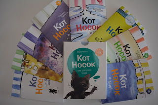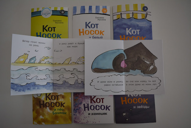 Набор из 8 тонких книг про забавного кота Носка, "Много букв". Это продолжение серии книг для первого чтения, их написала Татьяна Руссита. Предыдущие наборы назывались "Четыре буквы", "Шесть букв" и "Семь букв" - соответственно они отличаются по сложности, сначала на развороте буквально пара коротких слов, постепенно ребенок учится читать истории чуть длиннее.