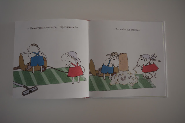 Бе и Ме - забавные барашки, сюжет простой, гуляющий из книги в книгу - решили пропылесосить, потом что-то пошло не так (в данном случае - засосался носок), включили пылесос на обратную тягу или просто открыли, и весь мусоры и пыль разлетелись опять по квартире.