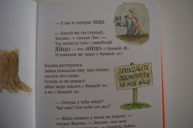 Например, может быть голова героя нарисована перед его репликой - по-моему, гениально! Ребенку так понятнее, кто что говорит. Позже этот прием из книги убирается, вообще сложность и объем рассказов постепенно нарастает.