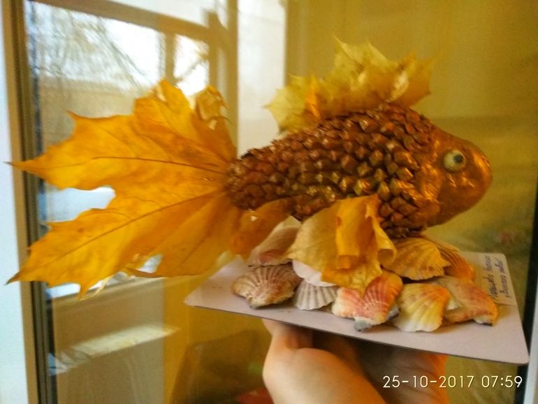 ДД. Туловище из пластелина. Шишки обычные сосновые, разобрала на лепесточки, воткнула в пластелин соответственно натуре( по картинке): мелкие- хвост и спинка, крупные- бока и брюшко. Покрасили акрилловыми красками, сделали щелки для плавников, хвоста. Набрали красивых листочков, вставили в щелки. Глазки- шляпки от желудей.
