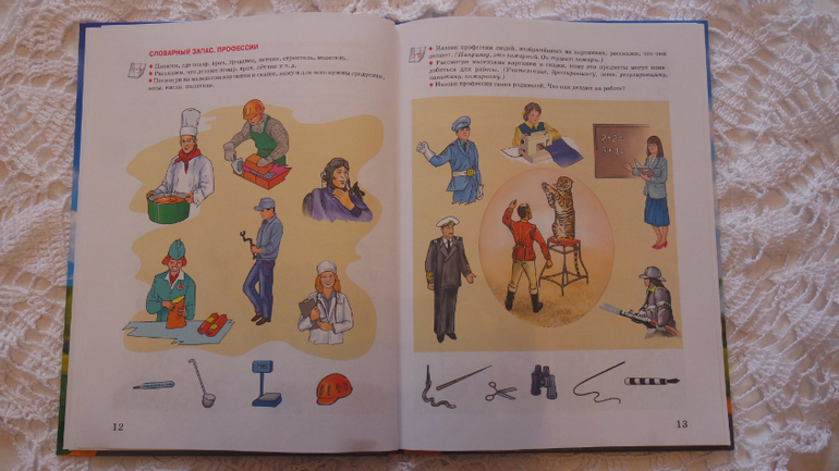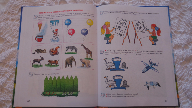 Что значит "книга рассчитана для детей от 2 до 7 лет"? Дети в 2 года и в 4 года сильно отличаются, но автору удалось подобрать интересный материал и к каждой теме прописать вопросы для разных возрастов 2-3, 3-4, 4-5, 5-6. С одной стороны -- это помощь родителям и подсказка возрастных норм, с другой стороны-- это одна удобная книга на 5 лет. Мне очень удобно заниматься по книге сразу с тремя детьми.