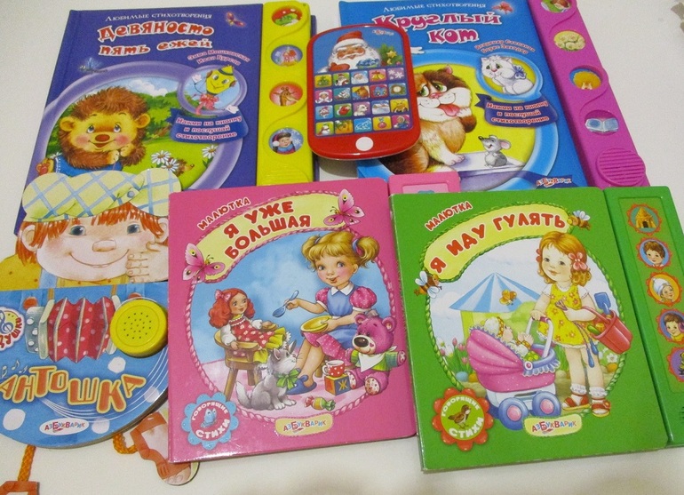 КнигиВесной я писала о замечательных книгах издательства "Азбукварик" (вот мой предыдущий отзыв о них). Прошло полгода и наша библиотека пополнилась новыми замечательными недорогими музыкальными книгами. Моей маленькой дочке нравятся книги со звуковым модулем, да и мне тоже - появляется хоть немного свободного времени пока дочка увлеченно нажимает кнопочки на книгах и слушает стихотворения или песенки.