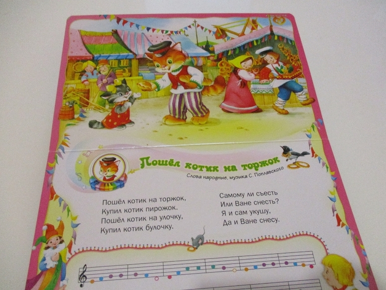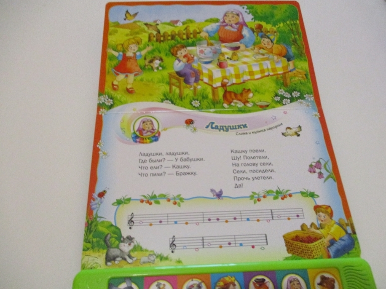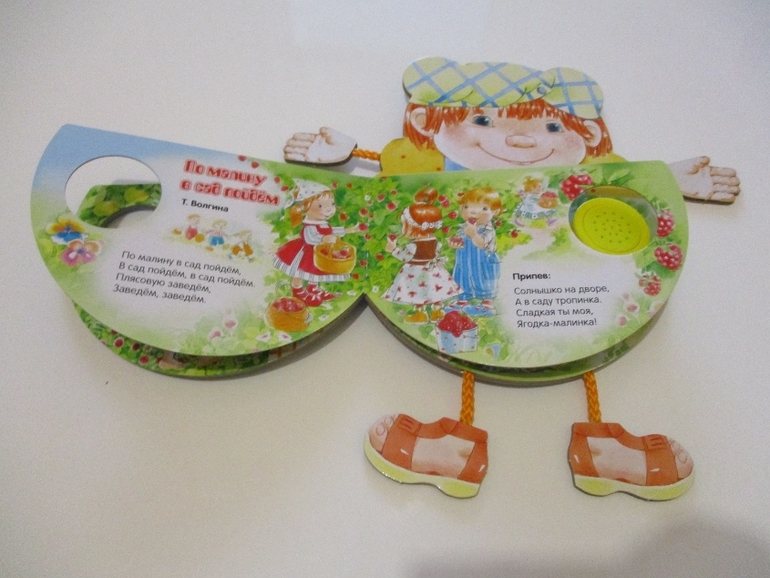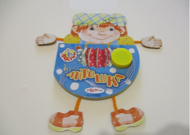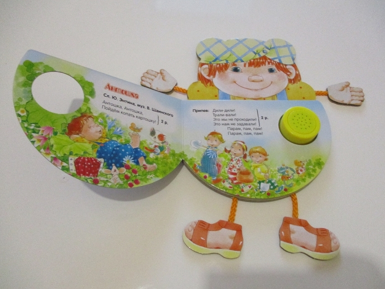 Книжка из серии "Ладушки. Антошка" выполнена в виде озорного Антошки с ножками и ручками на верёвочках и тремя задорными песенками: «Антошка» (песенка озвучена на модуле - она в книжке всего одна, а не три как думают многие), а также слова песен «Кто пасётся на лугу?», «По малину в сад пойдём». Картинки очень добрые и яркие.