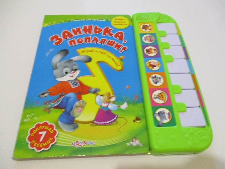 Абсолютный хит - книжка-пианино "Заинька, поплыши". На момент покупки выбор был не слишком большой и я выбрала данную книжку. На данный момент данной книги нет в продаже, но есть похожие и я думаю, что не менее интересные книжки из серии "Книга-пианино". Книга стостоит из самой книжки и пианино, которое в нее вставляется. Очень удобно, что есть возможность снять пианино и взять его с собой в дорогу. Пианино состоит из 7 кнопок-песенок и клавиш. С помощью этих клавиш можно сыграть песенку, у нас они неплохо получаются. Песенки очень задорные и веселые. Вот ссылка на эти книжки