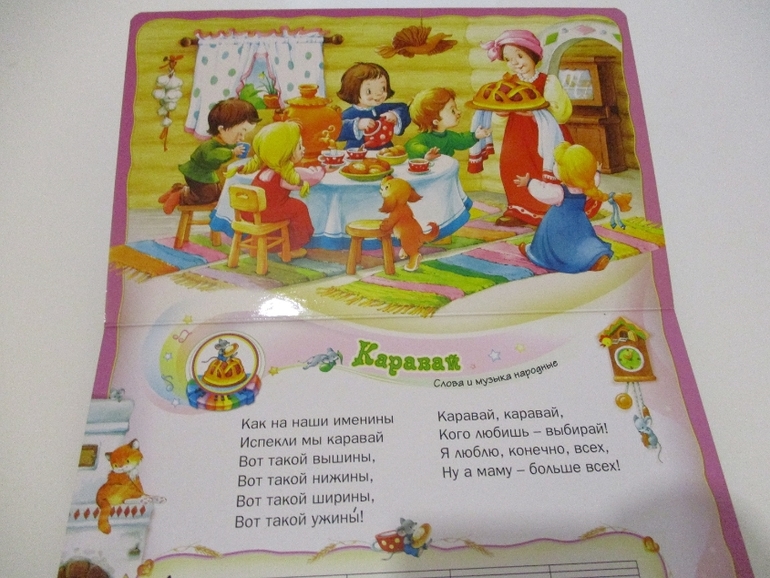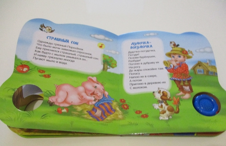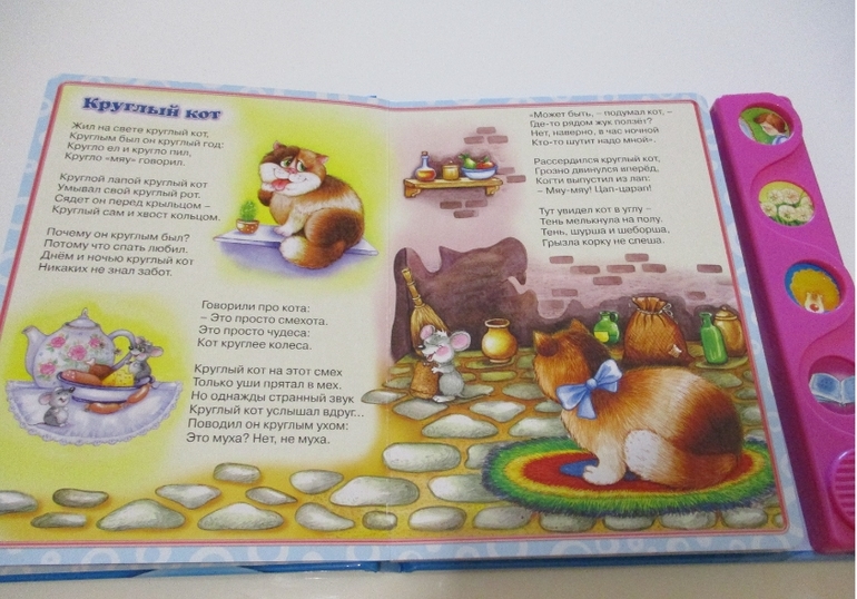 В каждой из книжек по 8 разворотов и по 4 музыкальных кнопки. Здесь есть что посмотреть ребенку, что послушать и что почитать маме или папе ребенку перед сном. У нас книги "Девяносто пять ежей" и "Круглый кот". Отличные книги за такую невысокую стоимость. Их приятно держать в руках и они очень нравятся моим дочкам.