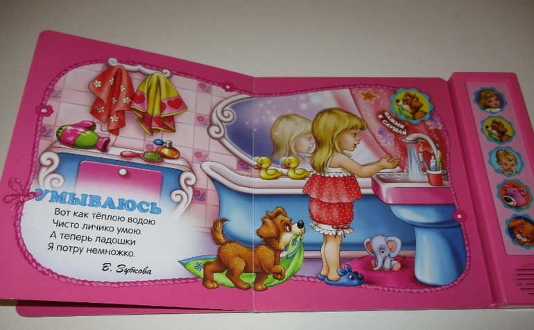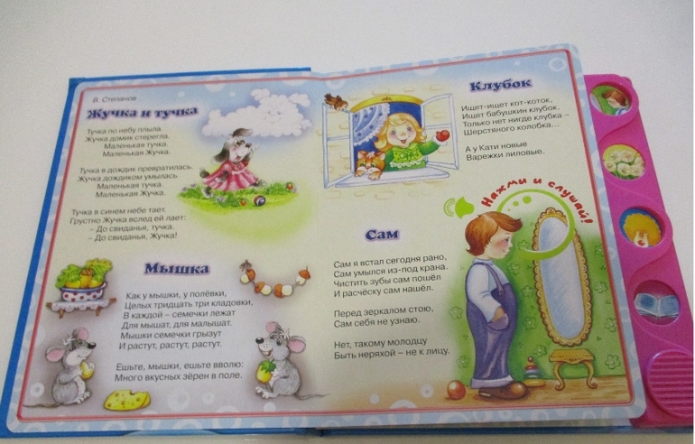 Из серии "Малютка" у нас есть 2 книжки "Я уже большая" и "Я иду гулять". В каждой из книг по 5 разворотов и по 5 музыкальных кнопок, нажав которые можно прослушать небольшие стихотворения, соответствующие данному развороту книги. Вот эта серия нам очень нравится. Смотрите, какие замечательные стихотворения и иллстрации к ним.