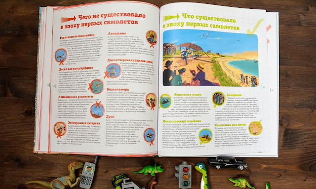 Эта необычная книга устроена так: разворот с каким-нибудь знаменитым событием, при этом на рисунке допущено 8 исторических ошибок. Они небанальные, но и не слишком сложные, в общем, возраст рекомендован адекватно.