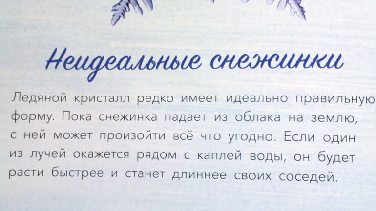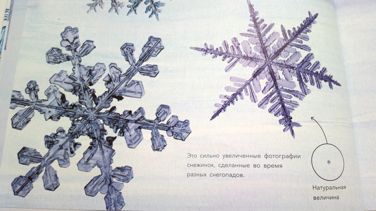 Мне очень понравилось то, что в книге есть реальные размеры снежинок, ведь для ребенка понять, что снежинка увеличена в несколько раз трудно. А тут все наглядно видно, вот эта точка увеличенная выглядит так.