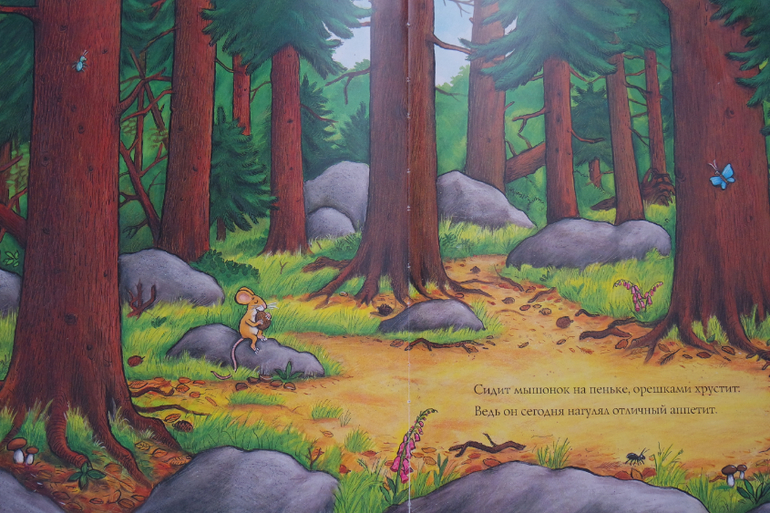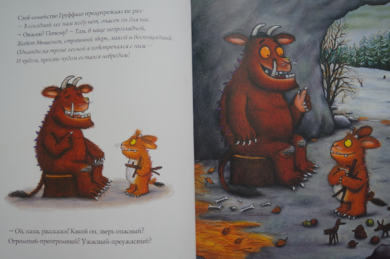 Груффало, конечно, очень страшный зверь, но сказка про умного мышонка!Маленький зверек, которого может обидеть каждый лесной житель, придумал страшного друга. Однажды мышонок встретил Груффу, испугался, но придумал как обмануть страшного зверя.
