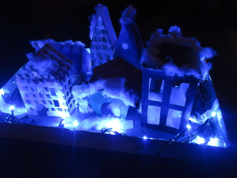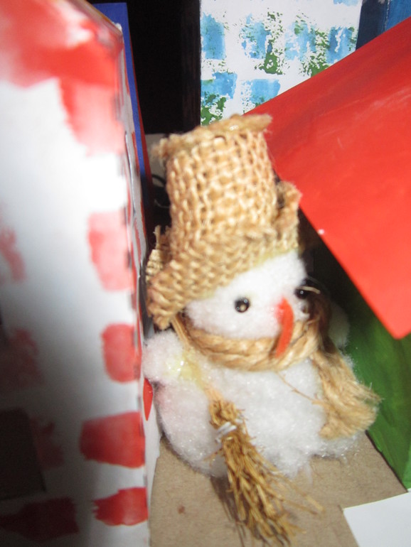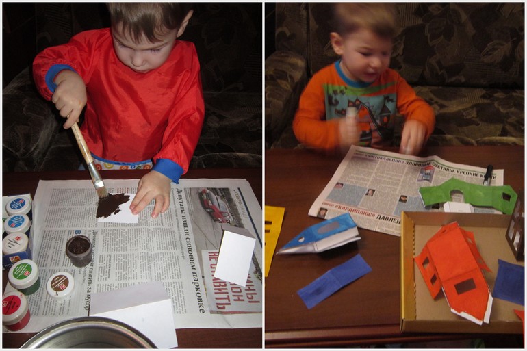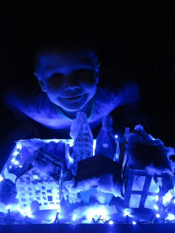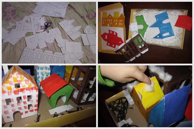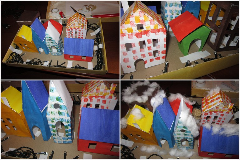 творили долго и тщательно. подходов за 5, наверно. папа распечатывал, я вырезала и сгибала. Мишка(3,10) красил. Мишка клеем мазал. вату лепил. издевался над гирляндой. Вася(1,2) пищал от восторга и пытался дотянуться хоть до чего-нибудь и попробовать на зуб. первую гирлянду прикрепили ёлочную. она сказала "Пф-ф" и сдохла. запахло палёным. качество отменное, как говорится. от греха подальше, чтоб не спалить садик, новую сделали на батарейках. специальная гирлянда для украшения одежды. не греется.