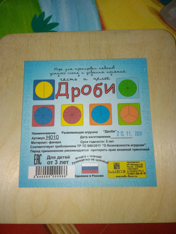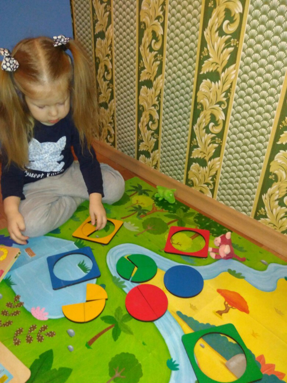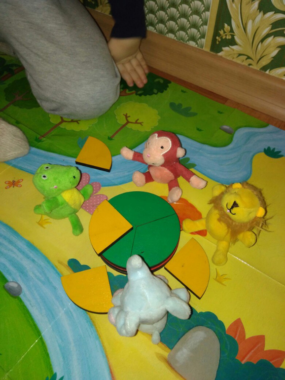 Потом достала я набор Дроби Никитина. Разобрали понятия «целый» и «части». Делили торт сначала на 2 равные части, потом на 3, 4 и т.д. Складывали, считали. Конечно, пока дробям ребенка я не учу, но вот на развитие внимания и моторики с этим наборчиком поиграть можно хорошо. А мамам школьников рекомендую взять на заметку. Если бы на момент изучения дробей у меня было такое наглядное пособие, было бы гораздо проще разобраться, что к чему)