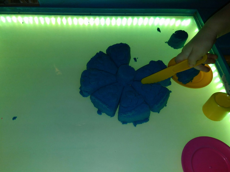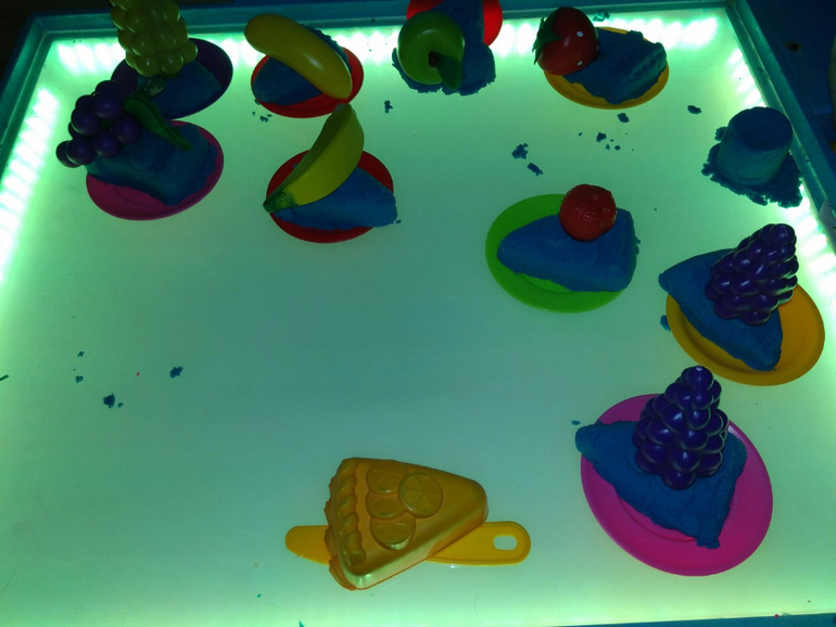 Потом в ход пошел кинетический песок. Лепили торт, резали на кусочки. Достали корзину с игрушечными овощами и фруктами. Нужно было отсеять овощи и украсить тортик только фруктами и ягодами.