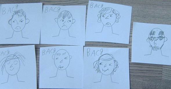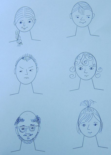 На занятии я выкладываю несколько листов, на каждом из которых по шесть смешных «портретов». Дети должны тихо, никому не говоря, выбрать себе одного персонажа. И на отдельной карточке с шаблоном (овал лица и шея) нарисовать его портрет. Закончил - выбираешь нового героя и его тоже рисуешь.