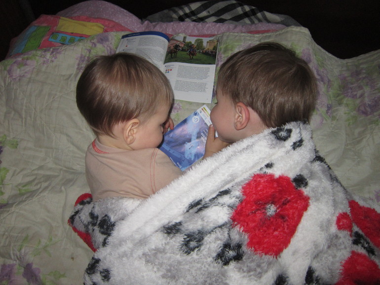 протягивается рука и даёт младшему брату машинку в кровать. Вася "лёг" спать, а Миша ещё выбирает машинку на утро в садик. Младший тоже хочет играть. Старший даёт ему что-нибудь "на, не скучай".