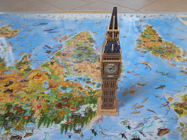 Переворачиваем страницу - Великобритания, Лондон, Букингемский дворец, королева, гвардейцы, традиционное чаепитие. Это все нам уже было знакомо по книге Мирослава Шашека Это Лондон. Не беда, повторение - мать учения. Находим на карте Великобританию и водружаем туда макет Биг-Бена (деревянный 3D пазл, производитель Educa)