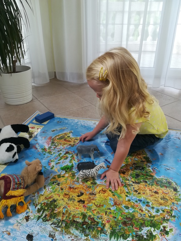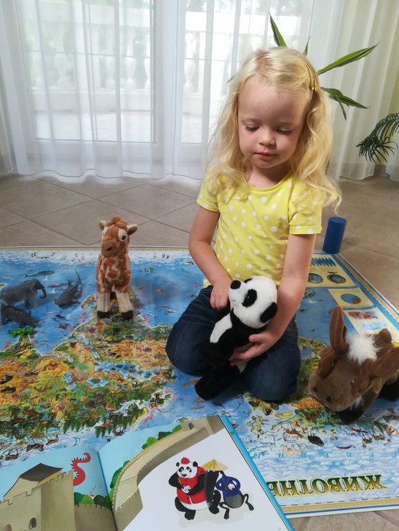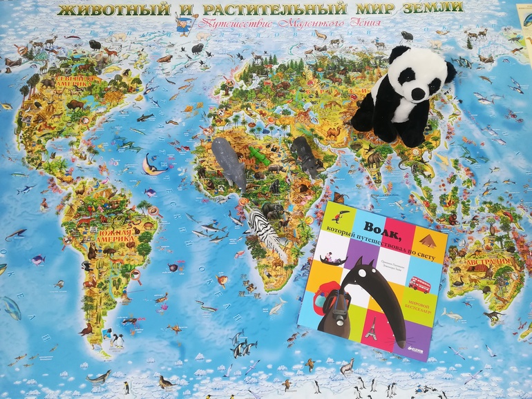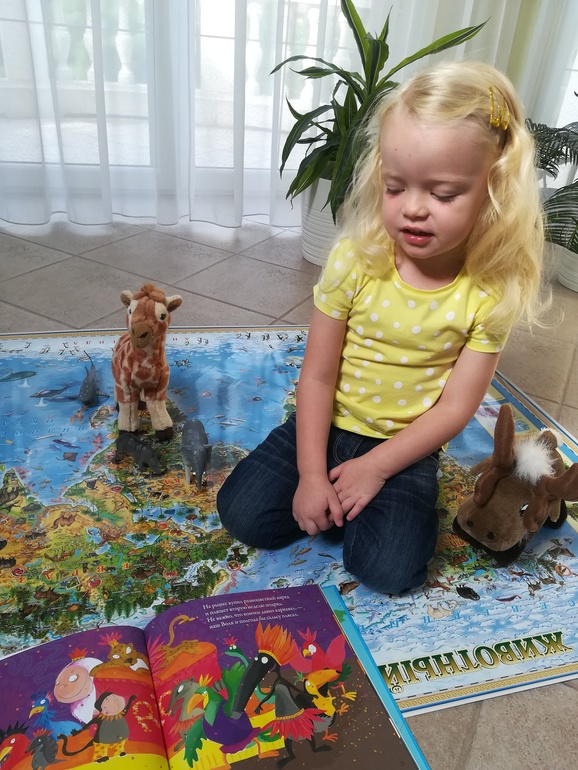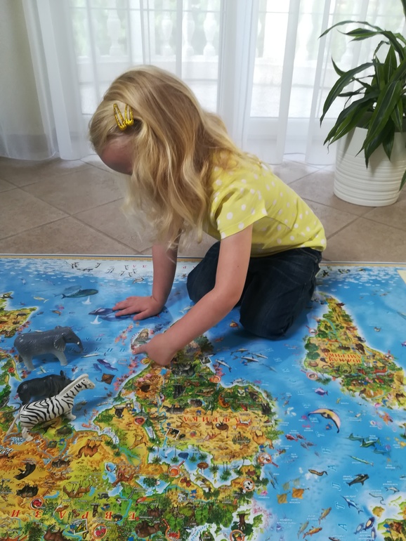 У нас вот такая карта Животный и растительный мир Земли. Детская карта. Разложили ее на полу, так удобнее. Грета с удовольствием и легкостью отправляется в кругосветное путешествие и перемещается с одного континента на другой.