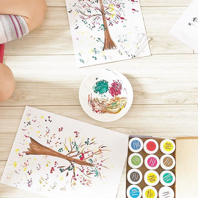 Первая работа, требуется; лист А4, ватные палочки, гуашь и палитра или просто блюдце) Вы рисуете ствол, а ребенок берет несколько ватных палочек и поочередного обмакивает их в краску и легким движением руки печатает листья!