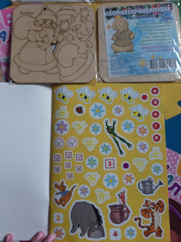 Сначала купила с Мини Маус. Дочь все сделала за один присест, она любит подобные вещи, но обычно быстрее надоедает. В общем, сегодня скупили всю серию. Еще поделки новогодние из фанеры, по-моему, отличные, будут объемные. Можно красками расрашивать. Фото не супер, некогда красиво фотографировать, но поделиться находками хочется ))
