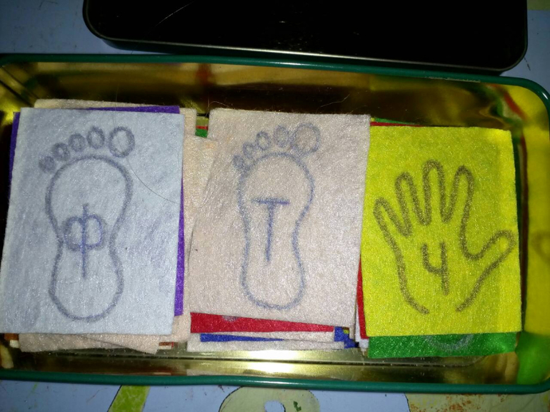 - "Ножки и ладошки" из фетра. Сшила сама, идею нагло утащила у той же мастерицы из Одессы, предварительно спросив разрешения (эта игра - полностью ее разработка, но она использовала ламинированный картон, а я фетр). Задача - назвать букву на карточке, накрыв саму карточку ножкой или ладошкой, в зависимости от того, что на ней нарисовано:
