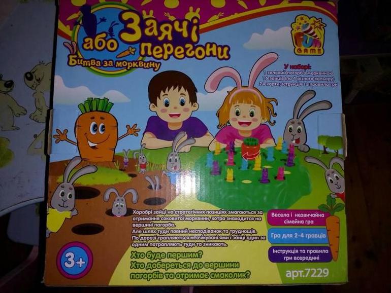 - "Выдерни морковку". У нас представлена украиноязычной версией коробки)) "Заячі перегони". Это первая наша игра, со знакомства с которой и появился у Василисы интерес к настолкам. Идея проста: доберись до морковки быстрее соперников. Но по дороге... попадаются внезапные ямы: