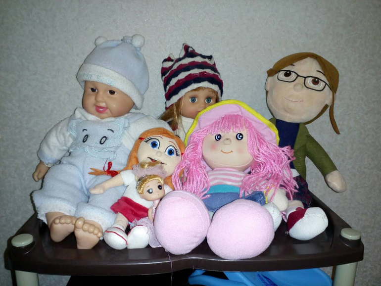 Далее, куклы-младенцы разных размеров, кукла тканевая, кукла мягконабивная, кукла ароматизированная "Йогуртинис" (модель не знаю))), кукла шарнирная из "Фикс Прайс" (да-да, мы приперли ее аж с Нижнего Тагила, побывав в гостях!):