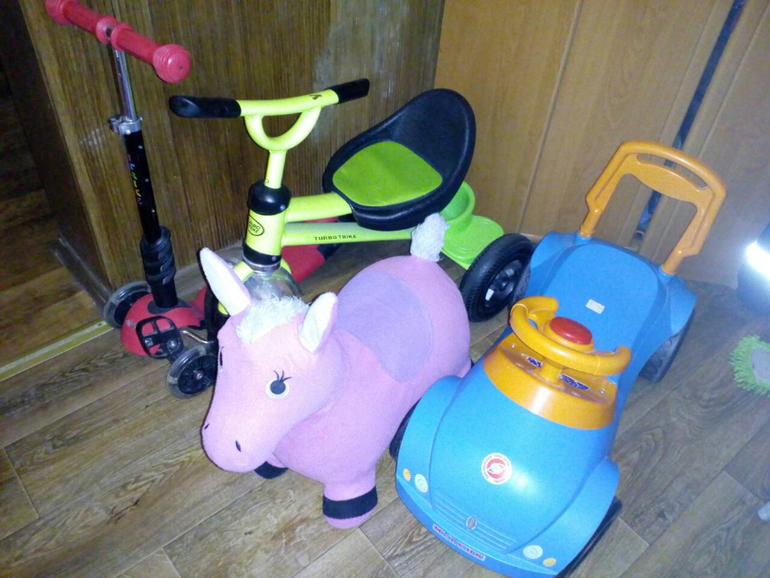 - Ослик-прыгун, машинка-толокар, велосипед и самокат. Да-да, это непременный атрибут не очень большого одноэтажного дома ))))))
