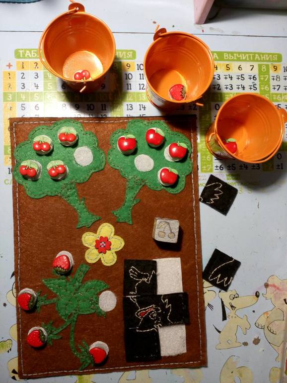 - "Фруктовый сад" от HABA. Видоизменен и сшит мной, так как лишних 1000 гривен у нас не было, а играть ОЧЕНЬ хотелось))) Вместо 4 видов фруктов у нас 3, ворон - не из 9 частей, а из 6. Зато играем быстрее)) Василисе нравится. Плюс игра командная, не нужно играть "против" соперников, соперником выступает зловредный ворон)))