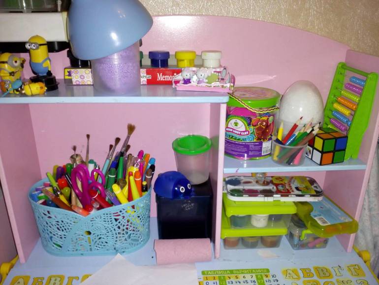 Книги спокойно стоят на полках, канцтовары - на парте и в парте (внутри - преимущественно раскраски / наклейки / обводилки / журналы / вырезалки / блокноты и тому подобное):