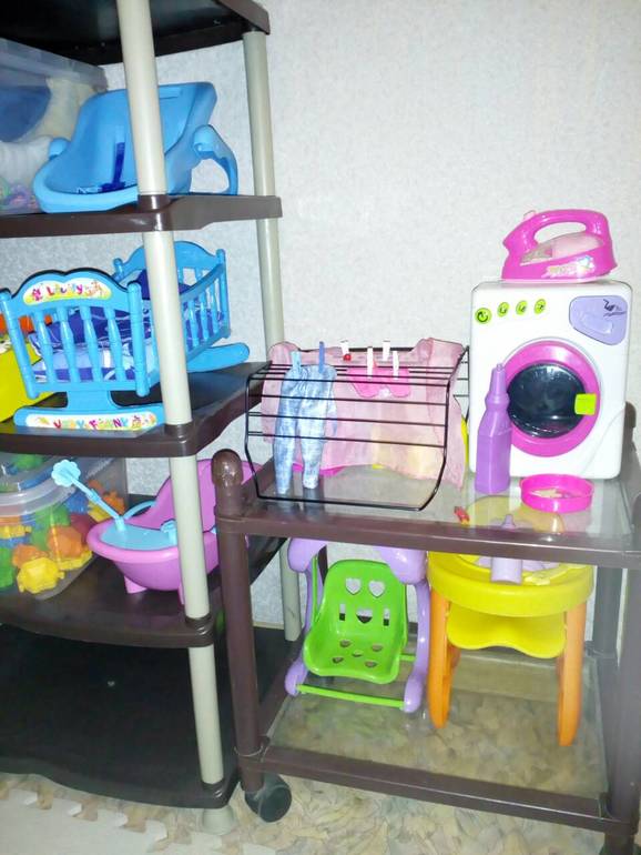 - Иные аксессуары к куклам: стульчик для кормления, качелька, автокресло, кровати, горшок, набор посуды, одежда (все перечисленное, кроме кроватей - из нежно любимого мной "Фикс Прайса", если б он в Одессе был, я б тут и жила))) Кровати - одна самодельная, из коробки от электронной книги, другая - простенькая с сайта "Бэбиплюс". А еще - стиральная машинка (светит, крутит барабан, издает звуки стирки)), утюг со звуком и светом и самодельная сушилка с миниатюрными прищепочками. Все активно используется ребенком, за исключением автокресла (его она почему-то берет нечасто):