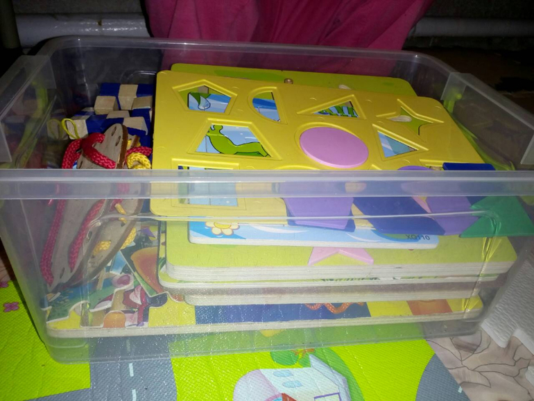 Все игрушки у Василисы рассортированы по прозрачным пластиковым боксам, это очень удобно и для меня (в доме порядок), и для нее (сквозь прозрачные стенки отлично видно, какие внутри игрушки).