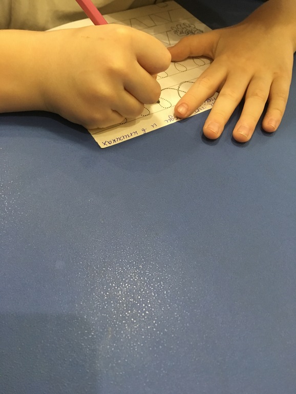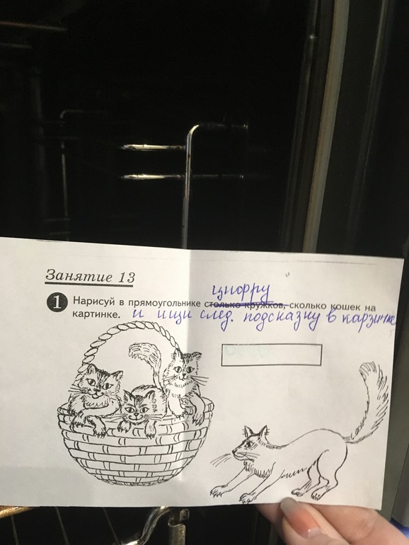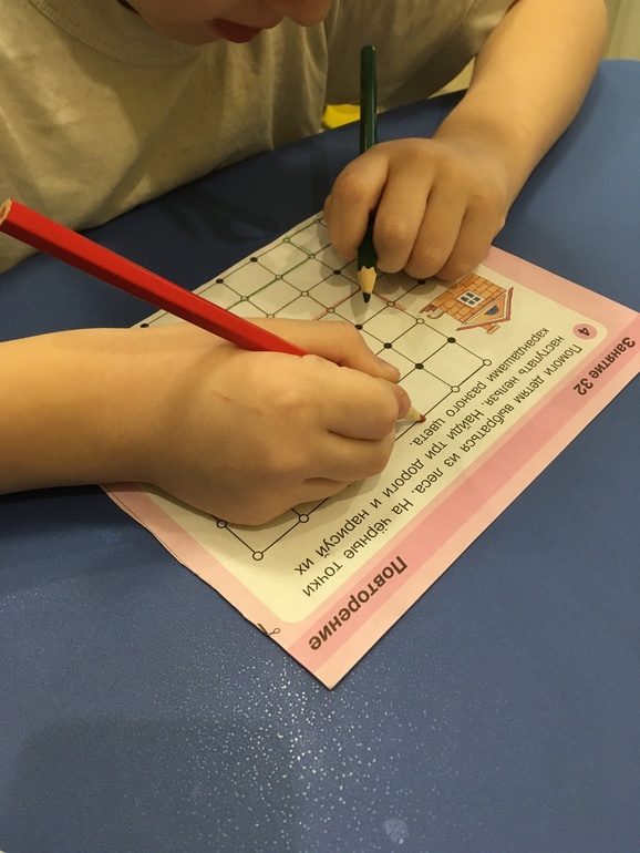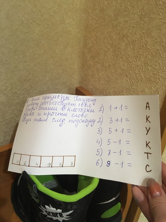 Справился. Только с цифрой 12 не получилось. Считать устно умеет, а писать знает только как до 10. Будем тренироваться. Получилось слово САПОГ. В нем мы нашли следующую подсказку