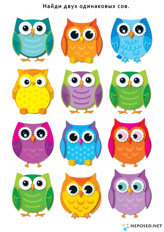 10-11. Найди двух одинаковых сов. Найди и раскрась предметы.