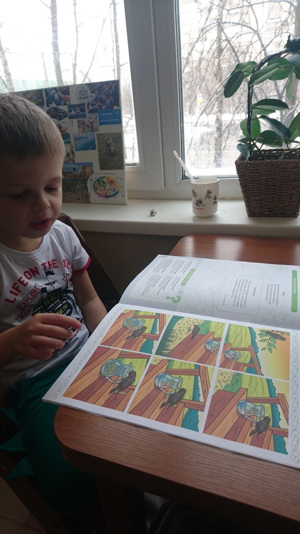 Потом прочитала ему коротенькую историю про галку, ответил на вопросы, прилагающиеся к тексту и под конец рассказал динозаврику (игрушке) по картинкам эту историю. Основное новое слово, которое вынесли из текста, "находчивый". Привела еще несколько примеров, когда кто либо из нашей семьи оказался находчивым, чтобы до конца уяснил это слово.