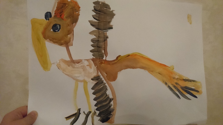 Читали рассказ Бианки "Чей нос лучше?". Обсудили всех птиц. Попросила Яра нарисовать кого-нибудь из этого рассказа. Сказал, что будет рисовать ястреба, но в итоге, судя по клюву, получился кондор)) Последнее задание было составить небольшой рассказ по рисунку, то есть в данном случае Яр составлял рассказ про кондора.