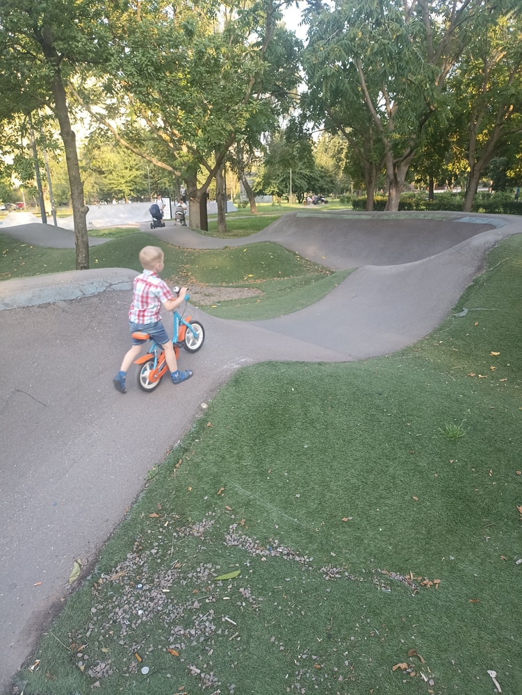 На велике, конечно, менее удобно, чем на самокате, но сын всё равно быстро освоился и катался там почти час!