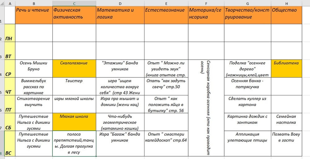 Потому вернулась к файлу, который вела когда-то со старшими детьми. Тут колонки,которые имеют условные названия вроде ,,творчество,, или ,,математика,, и какие-нибудь маленькие вещички,которые наполняют жизнь и отвечают задачам по ,,развитию,, какого-либо умения или навыка.