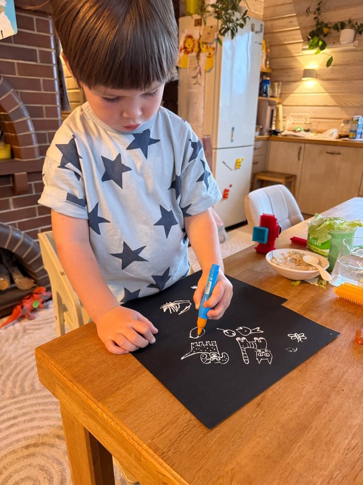 С творчеством или около него затык, пластилин и краски все как-то мимо нас проходят, что называется не захватывает. Ну да что уж. В один из дней много рисовали на черном фоне. Венька нашел трафареты своих любимых динозавров и вот пожалуйста)))