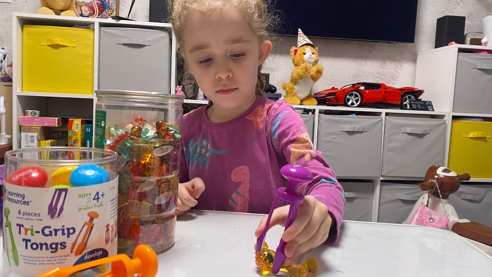 Кормили лошадей - делили поровну корм, потом тренировали пальчики к письму с помощью специальных пинцетов от Learning Resources.