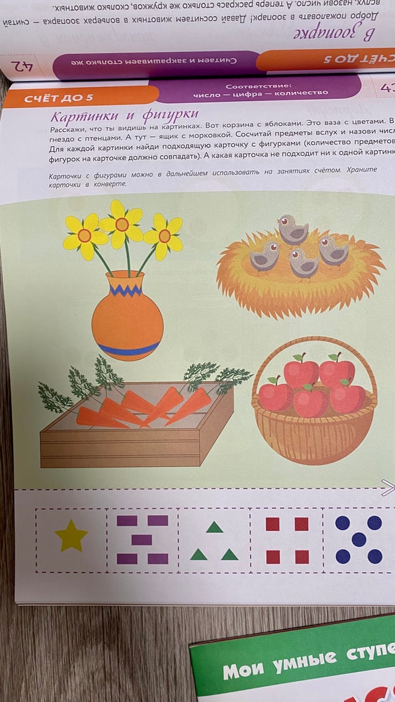 Тетрадь серии «Мои умные ступеньки» содержит простые задания на счёт, сравнение «больше‑меньше», нахождение нужного количества предметов. Упражнения короткие, рассчитаны на занятия по 10–15 минут и подходят для первых систематических занятий математикой. Больше похоже на журнал, который можно взять с собой . Скучноватый)