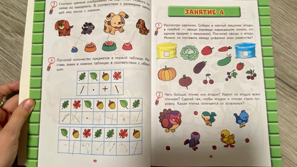 Пособие построено на авторской методике: упражнения направлены на развитие логики, внимания и воображения через игровые задачи и небольшие сюжеты. Здесь меньше «тренажёра цифр» и больше мыслительных задачек, соответствующих возрасту 3–4 лет. Но некоторые задания ввели меня в ступор. Графический диктант и копирование знаков явно не по возврату. Получилась какая то окрошка с детскими задачами и задачами, которые используются при подготовке к школе . Неоднозначные впечатления.