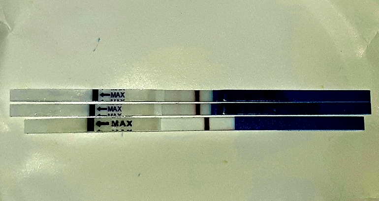 Вчера сделала тест вечером, показался призрак, даже на фото не поймать) утром сегодня - тоже самое. Сейчас сделала еще аж три теста (да, тестоманка я, каюсь). Стали ярче, верхние два одинаковой марки (Shans 25), нижний фрау… вроде бы фрау ярче должен быть, у него ведь чувствительность выше. А он еле виднеется, а на фото вообще не видно. Оно ли это? Или рано радоваться?Margosha