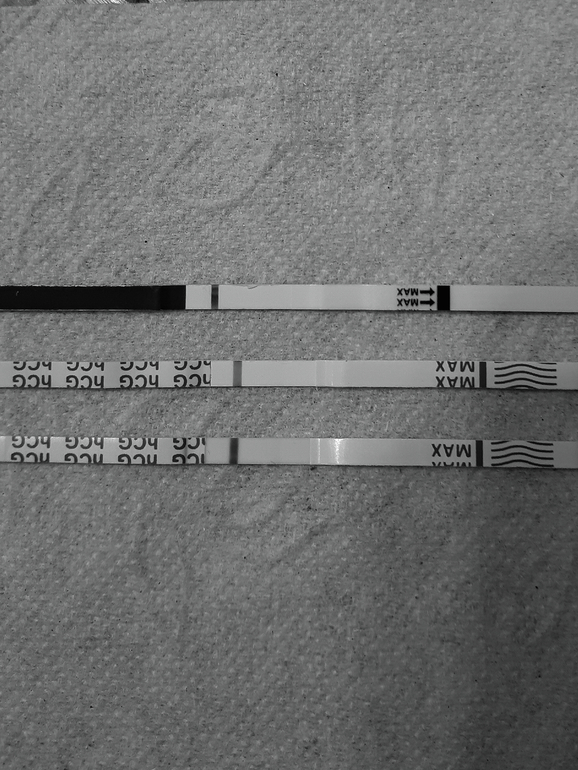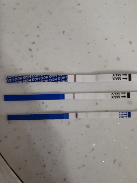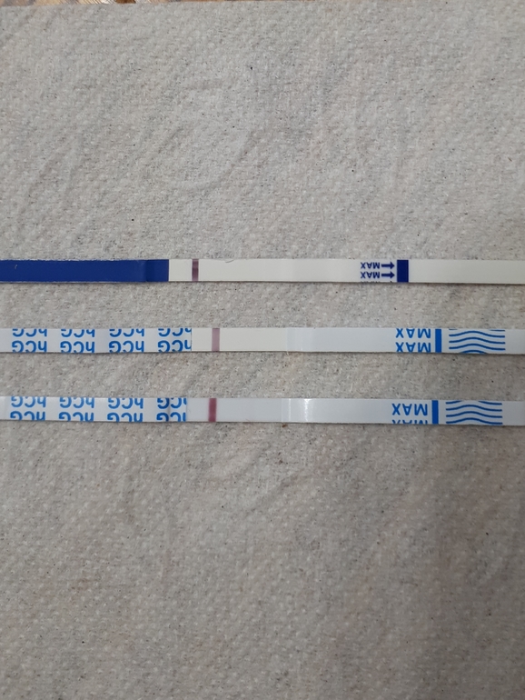 День х не жду 7-8 марта. На фото где 3 теста 2 верхних вчерашние. Нижний сегодняшний. И на нижнем глаз как будто цепляет что-то. Как бы хотелось чтоб это был не реагент.