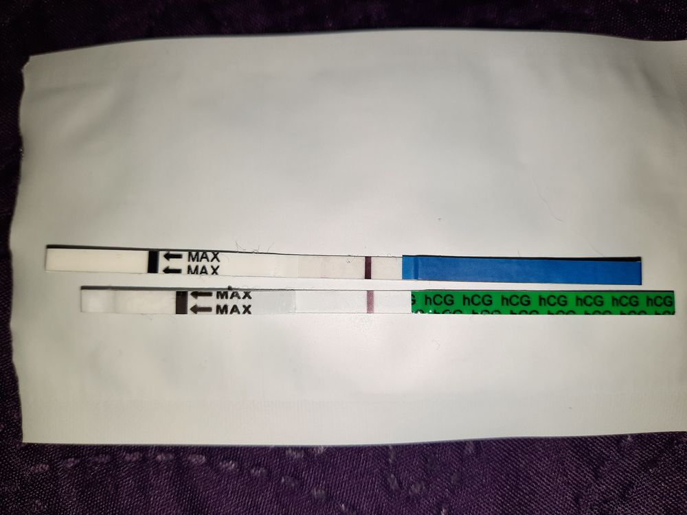 Девочки, помогите, пожалуйста. 9 ДПО сделала femitest ultra, чувствительность 10 мме, выдал хорошую различимую полоску, сделала другой фирмы "высокочувствительный тест 12.5 мме" там вроде чисто. Я сначала так обрадовалась а потом начиталась что femi реагентят жутко... не охотой обнадеживаться чтоб не расстраиваться потом. Посмотрите пожалуйста. Верхнее фото без обработки. Верхний тест femi нижний второй. Второе фото затемнила. Тесты ещё не подсохли окончательно