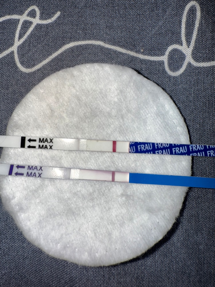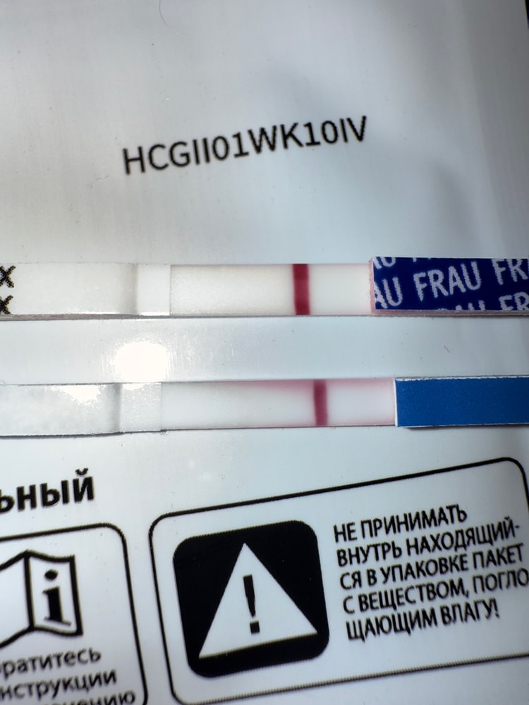 Вчера делала тест была слабая полоска, прикреплю фото, утром сделала 2 теста , на одном яркая 2, на фрау вроде нету … тесты фоткала сразу как замочила и чуть посохшие уже