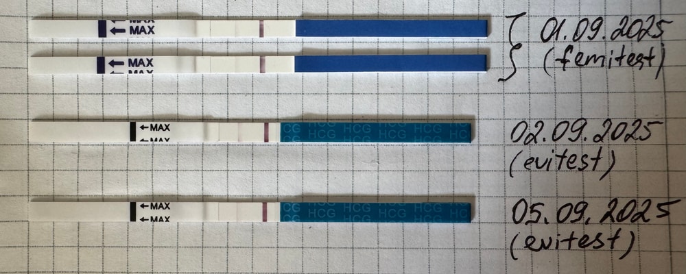 06.08 был первый день последних месячных. Обычно цикл составляет 25-26 дней. 01.09 и 02.09 сделала тест на беременность - показал очень бледную вторую полоску. Сегодня 05.09 сделала еще раз - ярче, как мне кажется, не стало…