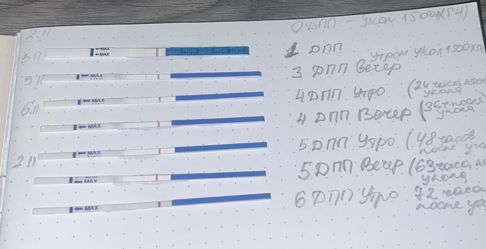 подсадка была 2.11(1 пятидневка 4АА)в это же день был укол ХГЧ 1500.Следующий укол 5.11 тоже 1500.Сегодня 6 ДПП,снова слабая полоска,с последнего укола прошло 72 часа.