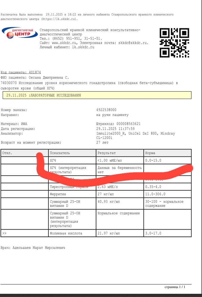 29.11 сдавала анализы крови (был 26 дц,10 дпо),сдавала на ферритин,витамин д и всякие для себя ,решила сдать и Хгч.В итоге был низкий уровень <1.
