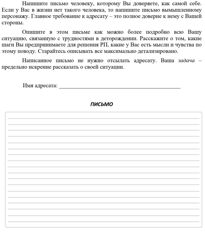 вариант 1: убрать письмо в укромное место и не возращаться к нему до тех пор, пока не наступит "пора" (когда будет пора, я скажу), а в группе написать, что письмо готово/написано, и тогда я задам вам пару вопросов (не относящихся к содержанию письма), которые могут дать вам информацию для решения проблемы с деторождением.